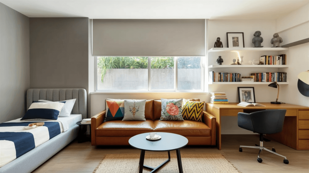 Combining the wardrobe and study table into one unit optimises space and creates a cleaner layout, especially in smaller rooms.