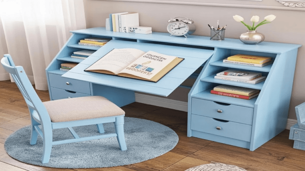A study table with storage allows children to keep everything they need in one place, reducing interruptions and improving focus.
