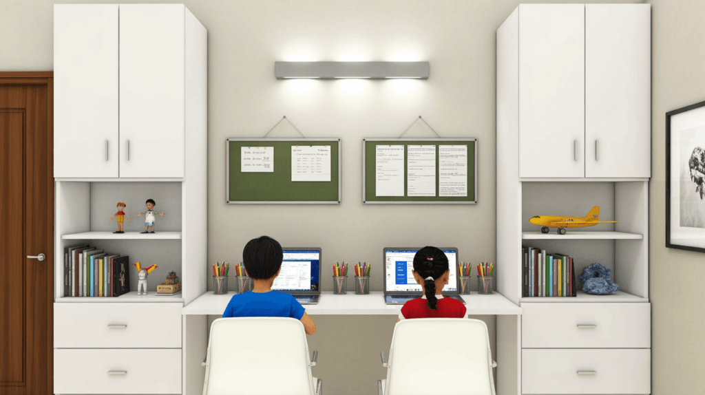Creative layouts help children feel motivated and independent. Here are practical, space-efficient kids’ study table designs that work beautifully in modern homes: